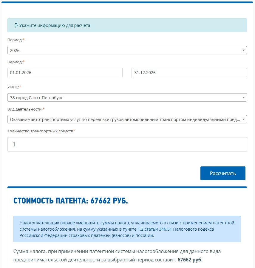 Для сравнения найдем на основе метода «по калькулятору» ПВГД для того же ИП из Санкт-Петербурга, который занимается грузоперевозкой. Введем в калькулятор ФНС параметры патента: