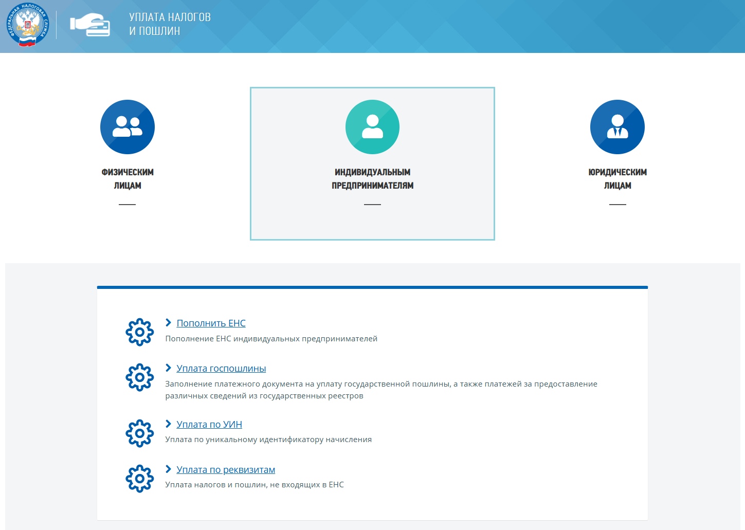 Выберите блок «Индивидуальный предприниматель», затем нажмите «Уплата госпошлины».